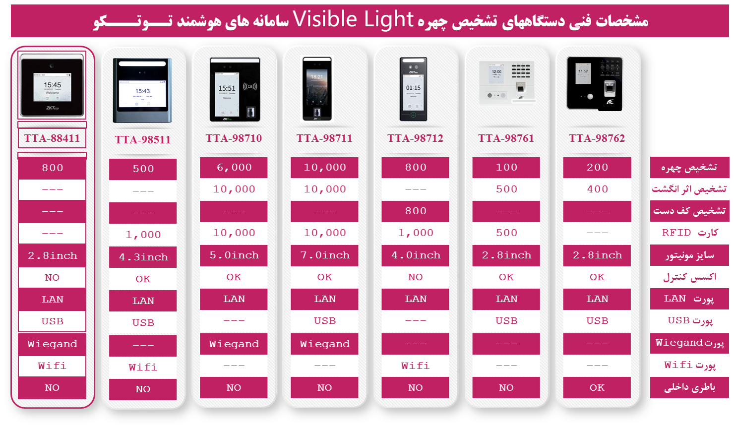 دستگاه حضور غیاب Visible Light مدل TTA-88411 یکی دیگر از دستگاههای حضور غیاب با فناوری پیشرفته و ظرفیت متوسط با قابلیت تشخیص چهره می باشد که از جدیدترین و بهروزترین فناوریهای پیشرفته حوزه تشخیص چهره بهره برده است . این دستگاه تمامی ویژگیهای مربوط به فناوری هوش مصنوعی Visibli light را دارا می باشد . قابلیت مشاهده و تشخیص افراد از فاصله 0.5 متر تا 3 متر ، قابلیت ضد تقلب ، سرعت تشخیص و پردازش فوق العاده بالا از مهمترین ویژگیهای این دستگاه به حساب میآید .