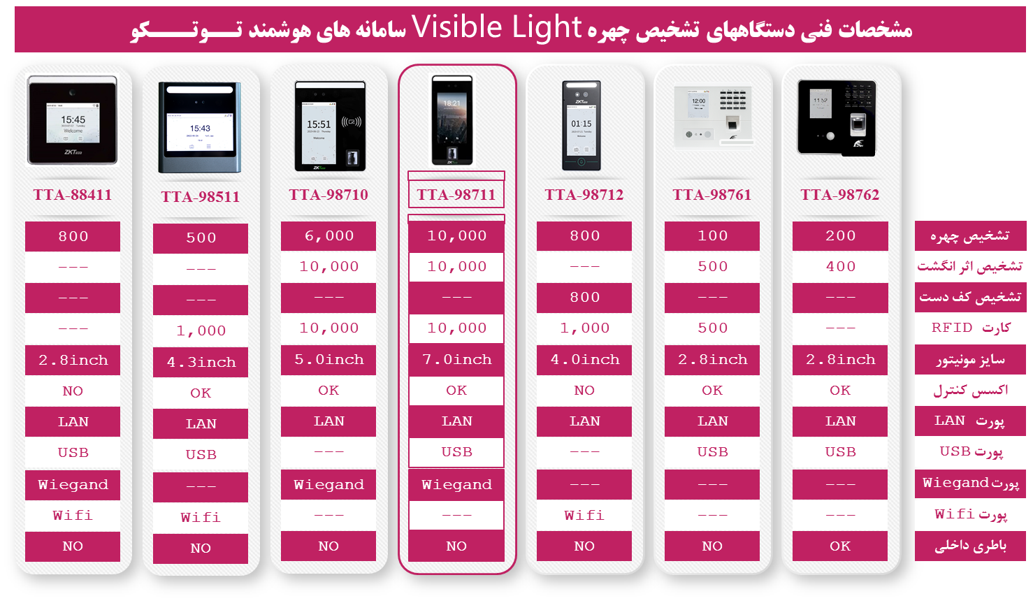 دستگاه حضور غیاب مدل TTA-98711 دارای ظرفیت ثبت 10000 چهره ، 10000 اثر انگشت و 10000 کارت را در دارا می باشد .این دستگاه ، مجهز به دوربین دوگانه جهت شناسایی دقیق چهره افراد، حتی در صورت پوشش بیش از نیمی از صورت، توسط ماسک یا عینک می باشد .