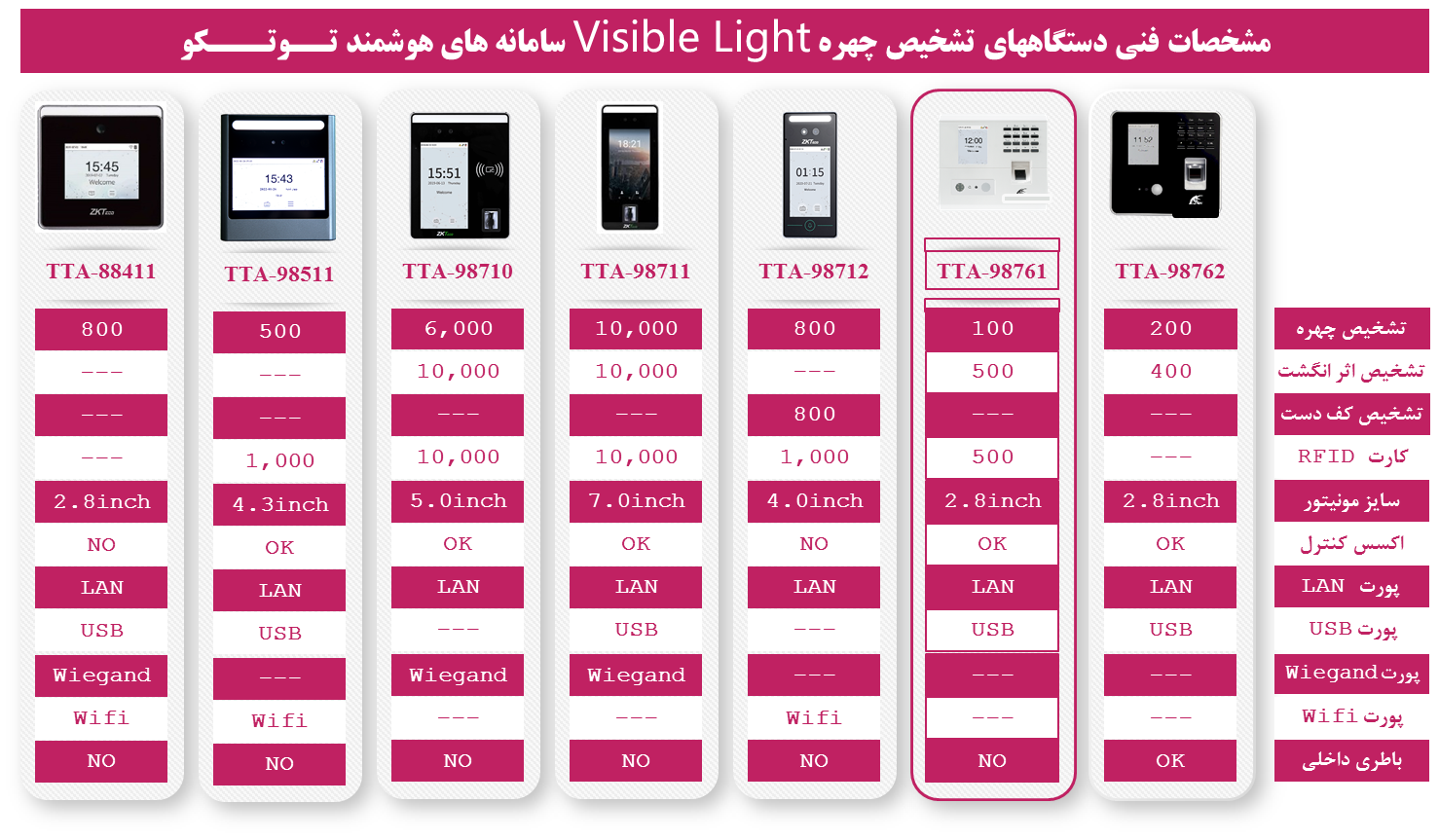 دستگاه حضور غیاب Visible Light مدل TTA-98761 یکی دیگر از دستگاههای حضور غیاب با فناوری پیشرفته و ظرفیت کوچک با قابلیت تشخیص چهره ، تشخیص اثر انگشت و کارت RFID می باشد که از جدیدترین و بهروزترین فناوریهای پیشرفته حوزه تشخیص چهره بهره برده است . این دستگاه تمامی ویژگیهای مربوط به فناوری هوش مصنوعی Visibli light را دارا می باشد . قابلیت مشاهده و تشخیص افراد از فاصله 0.5 متر تا 3 متر ، قابلیت ضد تقلب ، سرعت تشخیص و پردازش فوق العاده بالا از مهمترین ویژگیهای این دستگاه به حساب میآید که برای مشاغل و کسب و کارهای کوچک تا متوسط بسیار مناسب و ایدهآل میباشد..