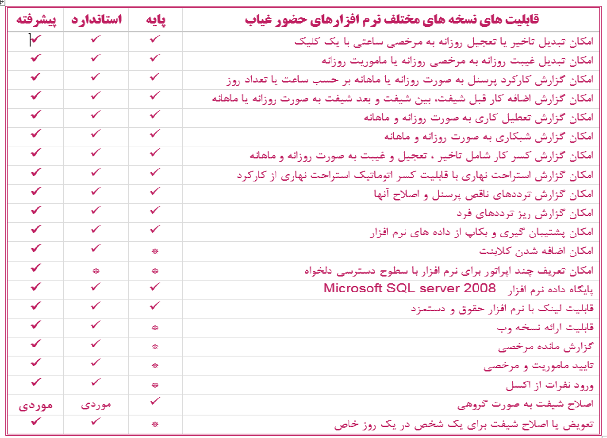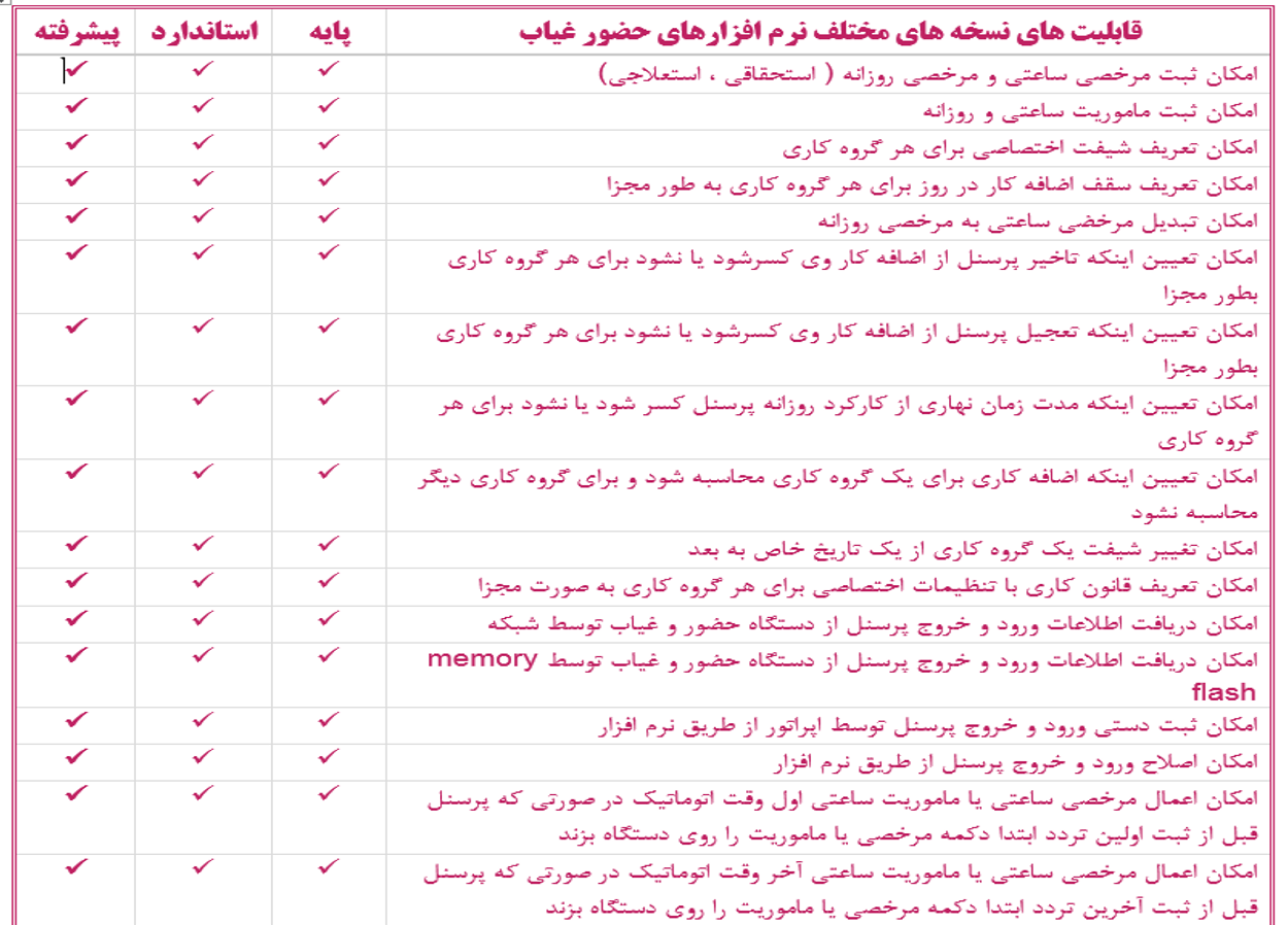 هر کدام از نرم افزارهای ارائه شده توسط سامانه های هوشمند توتکو در سه ورژن نرم افزار حضور غیاب پایه ، نرم افزار حضور غیاب استاندارد و نرم افزار حضور غیاب پیشرفته در دو پلتفرم تحت ویندور و تحت وب دارای قابلیتهای ارزشمندی همچون طراحی کاربرپسند و رابط کاربری منحصر به فردی ، نصب و راه اندازی سهل و آسان بوده و دارای ماژولهای مختلفی از قبیل مدیریت پرسنلی ، مدیریت انواع شیفت ، مدیریت مکان ها ، مدیریت قوانین ، مدیریت دستگاهها ، مدیریت اضافه کار ، مدیریت گزارشات و ارسال پیامک و ... بوده و قابلیت لینک شدن به سایر سیستمها از قبیل سیستم حسابداری و مالی را دارد .
